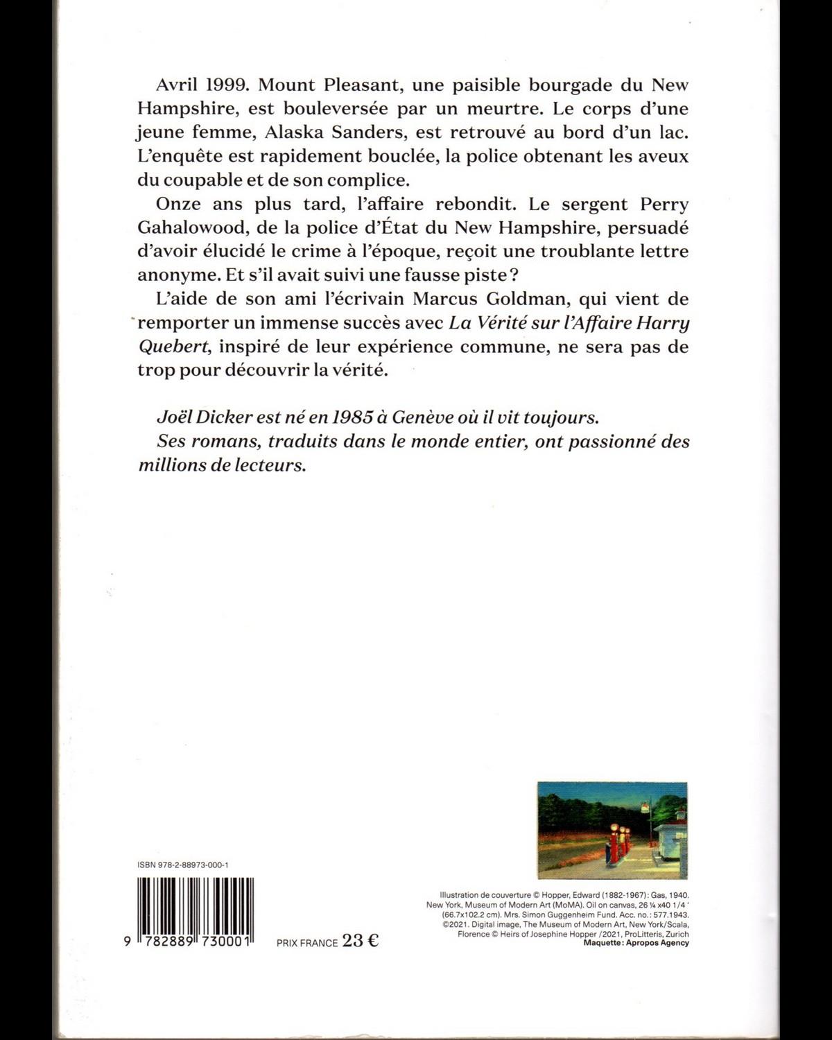 Avril 1999. Mount Pleasant, une paisible bourgade du New Hampshire, est bouleversée par un meurtre. Le corps d'une jeune femme, Alaska Sanders, est retrouvée au bord d'un lac. L'enquête est rapidement bouclée, la police obtenant les aveux du coupable et de son complice.