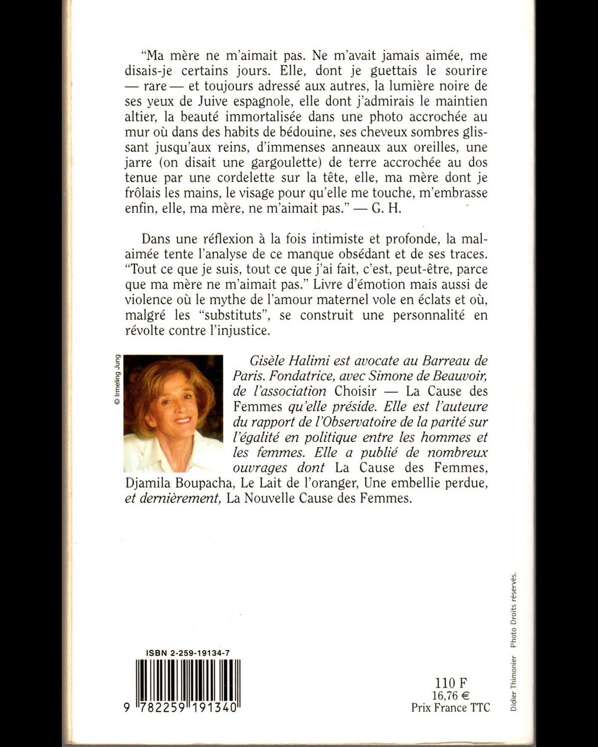 "Tout ce que je suis, tout ce que j'ai fait, c'est, peut-être, parce que ma mère ne m'aimait pas.". Gisèle Halimi analyse, d'une manière à la fois très fine et très violente, la profonde blessure de son enfance, l'élément déterminant de sa psychologie et de sa vie entière. "Ma mère ne m'aimait pas. Ne m'avait jamais aimée, me disais-je certains jours. Elle, dont je guettais le sourire - rare - et toujours adressé aux autres, la lumière noire de ses yeux de Juive espagnole, elle dont j'admirais le maintien altier, la beauté immortalisée dans une photo accrochée au mur où dans des habits de bédouine, ses cheveux sombres glissant jusqu'aux reins, d'immenses anneaux aux oreilles, une jarre (on disait une gargoulette) de terre accrochée au dos tenue par une cordelette sur la tête, elle, ma mère dont je frôlais les mains, le visage pour qu'elle me touche, m'embrasse enfin, elle, ma mère, ne m'aimait pas." - G.H. Dans une réflexion à la fois intimiste et profonde, la mal-aimée tente l'analyse de ce manque obsédant et de ses traces. "Tout ce que je suis, tout ce que j'ai fait, c'est, peut-être, parce que ma mère ne m'aimait pas." Livre d'émotion mais aussi de violence où le mythe de l'amour maternel vole en éclats et où, malgré les "substituts", se construit une personnalité en révolte contre l'injustice.