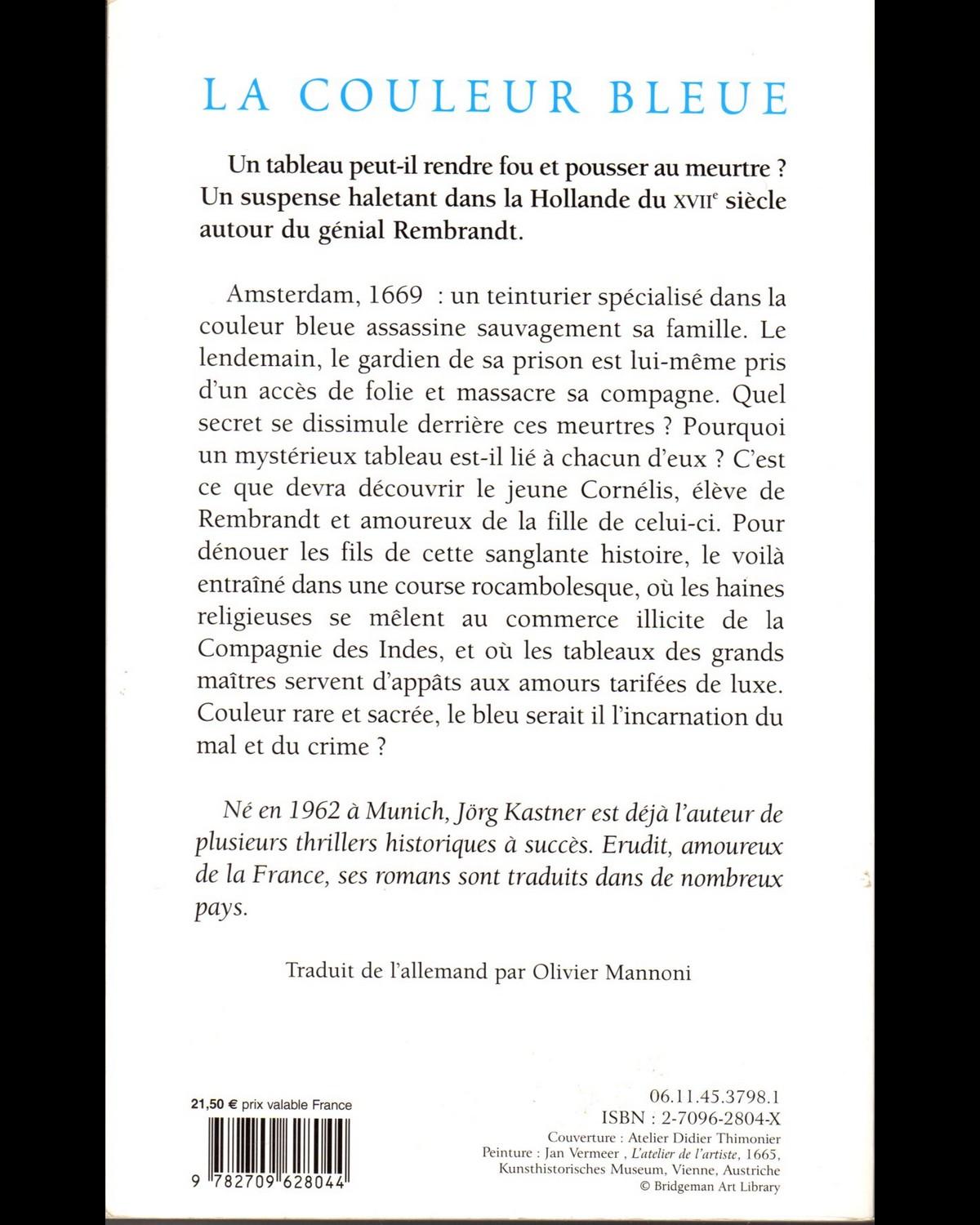 Un tableau peut-il rendre fou et pousser au meurtre ? Un suspense haletant dans la hollande du XVIIe siècle autour du génial Rembrandt. Amsterdam, 1669 : un teinturier spécialisé dans la couleur bleue assassine sauvagement sa famille. Le lendemain, le gardien de sa prison est lui-même pris d'un accès de folie et massacre sa compagne. Quel secret se dissimule derrière ces meurtres ? Pourquoi un mystérieux tableau est-il lié à chacun d'eux ? C'est ce que devra découvrir le jeune Cornélis, élève de Rembrandt et amoureux de la fille de celui-ci. Pour dénouer les fils de cette sanglante histoire, le voilà entraîné dans une course rocambolesque, où les haines religieuses se mêlent au commerce illicite de la Compagnie des Indes, et où les tableaux des grands maîtres servent d'appâts aux amours tarifées de luxe. Couleur rare et sacrée, le bleu serait il l'incarnation du mal et du crime ?