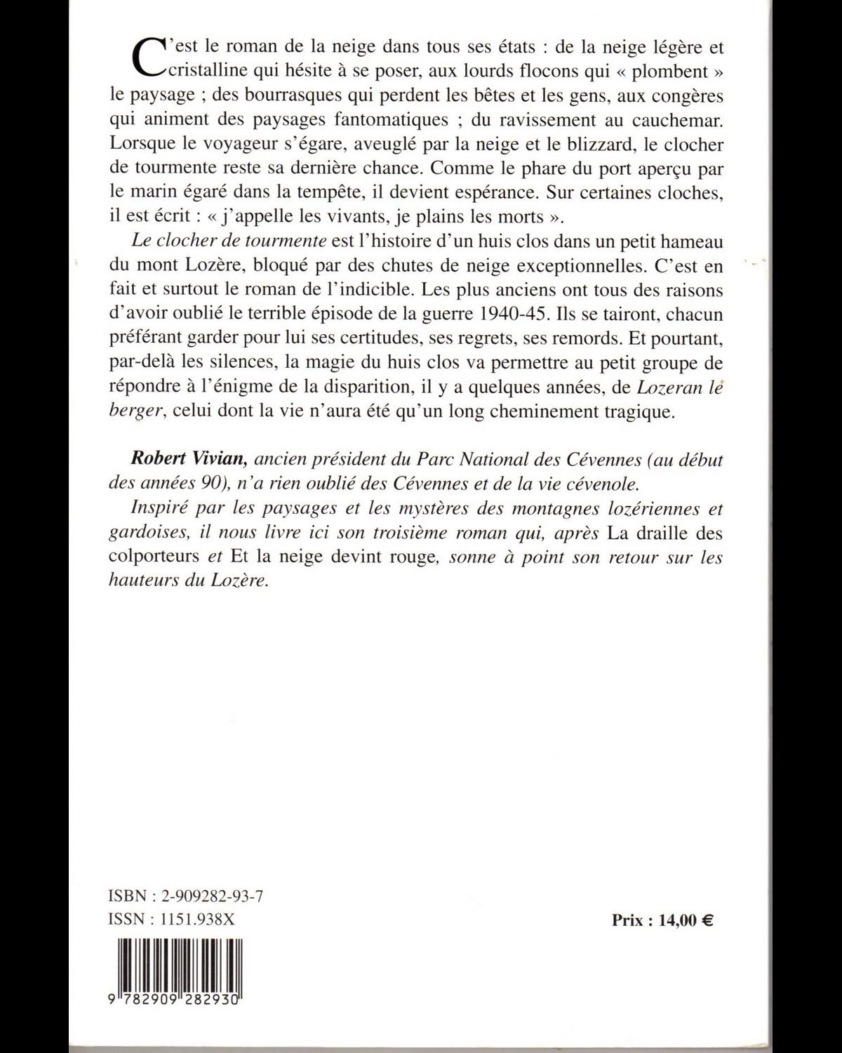 Le clocher de tourmente est l'histoire d'un huis clos dans un petit hameau du mont Lozère, bloqué par des chutes de neige exceptionnelles. C'est en fait et surtout le roman de l'indicible. Les plus anciens ont tous des raisons d'avoir oublié le terrible épisode de la guerre 1940-45. Ils se tairont, chacun préférant garder pour lui ses certitudes, ses regrets, ses remords. Et pourtant, par-delà les silences, la magie du huis clos va permettre au petit groupe de répondre à l'énigme de la disparition, il y a quelques années, de Lozeran le berger, celui dont la vie n'aura été qu'un long cheminement tragique.